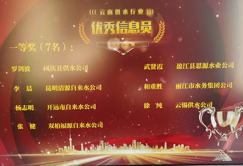 公司被云南省城镇供水协会评为2022年度信息工作先进单位,制水厂厂长罗剑波被评为信息工作先进个人一等奖。