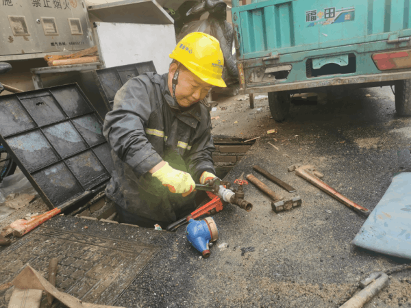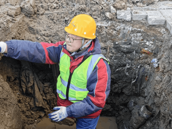 晚上10点,卫生路南丰街交口路发生漏水的消息再次转到政七项目部,维修人员马君皇等人立即前往。除夕夜晚,一步步查找漏点、清理淤泥、包裹抢修节,街头人声鼎沸“跨年”,基坑里维修人员操作有条不紊,直到凌晨3点完成管道修复,为一天的抢修工作画上句号。
