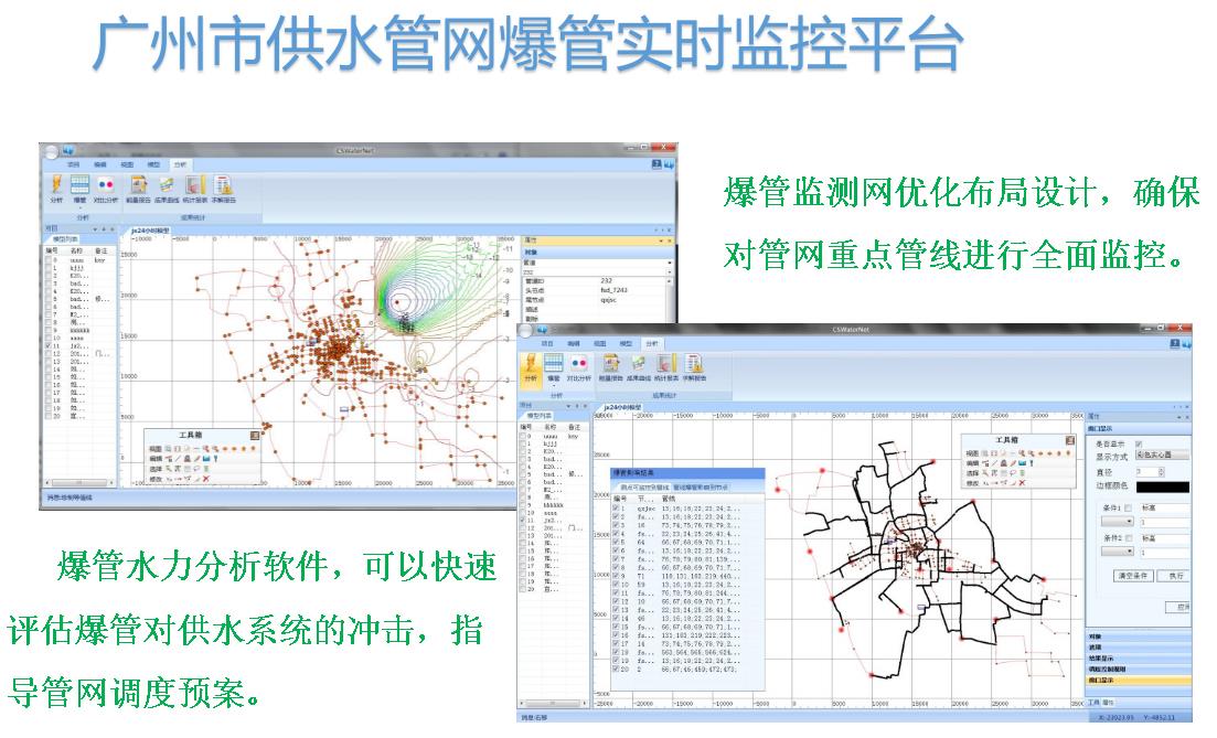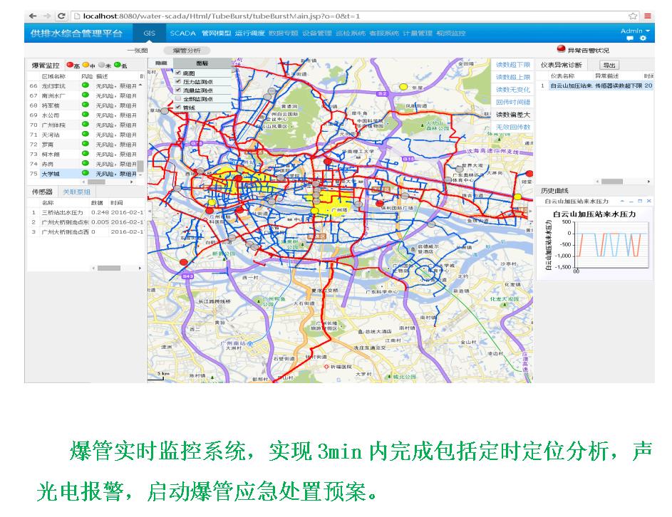 (2)快速高效实现爆管实时诊断,实时分析时间小于3分钟,DN800以上的爆管监控准确率达到80%以上,DN600以上的爆管监控准确率达到70%以上,DN400以上的爆管次数降低了30%。