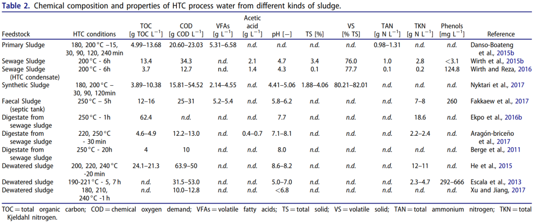 HTC工艺水含有高浓度的有机物,如总有机碳(TOC)、化学需氧量(COD)和生物需氧量(BOD5)浓度,以及相对丰富的土壤养分(N、P、K)。下表分别总结了文献关于污泥和生物质HTC工艺水的主要发现。