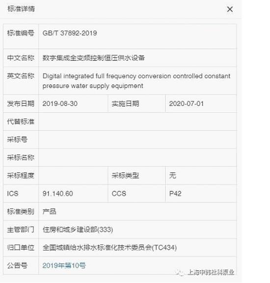 国家标准《数字集成全变频控制恒压供水设备》GB/T37892将于2020年7月1日正式实施。