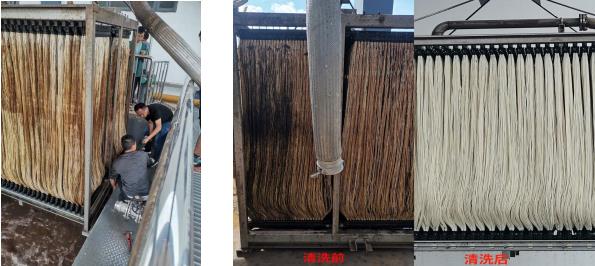 为减少清洗药剂的使用量,提高清洗的效果,在膜组件浸入清洗水池前,先把膜组件吊出安全空地用高压水枪进行初步粗清洗,去除MBR膜大面积污染物;之后浸没在专用清洗池内,清除污染物,膜性能恢复到接近初期值的状态。