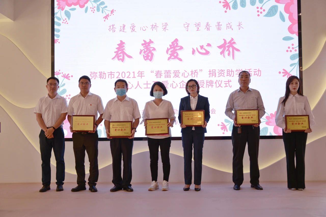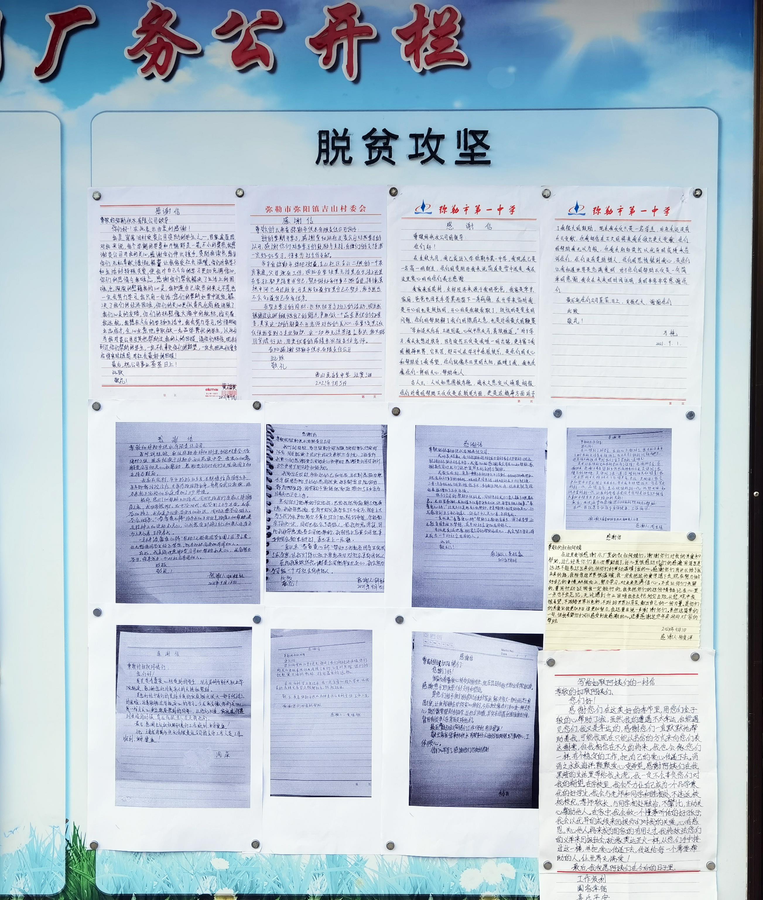 今年9月中旬,弥勒市供水公司参加了弥勒市妇女联合会举办的弥勒市2021年“春蕾爱心桥”捐资助学活动爱心企业及爱心人士授牌仪式活动。公司副总经理蔡锐出席了授牌仪式活动并收到了100名学生的感谢信。今年受捐助的学生包括了弥阳街道、竹园镇、巡检司镇等12个乡镇的小学、初中、高中学生。