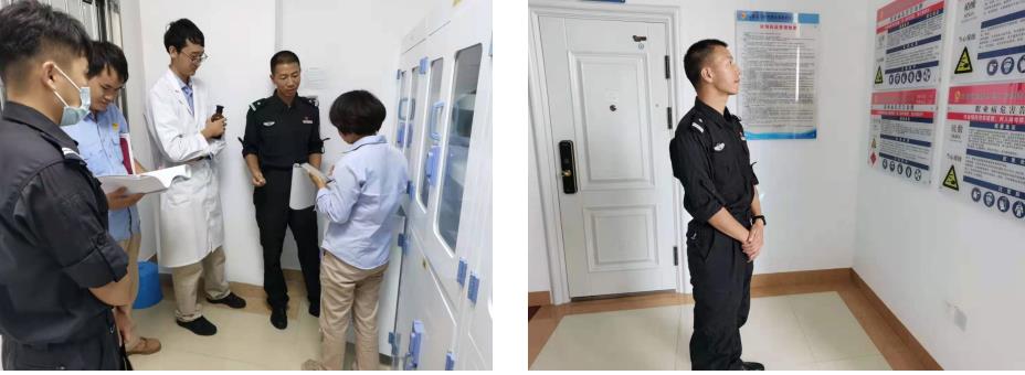 袁警官对我公司化学品设备设施。药品贮存环境、监控设备、双人双锁、药品室通风等细节进行详细的询问并表示希望公司部门员工按规范流程完善药品领取登记制度,实时更新,做好登记。进入药品室做好出入人员登记表、备案。