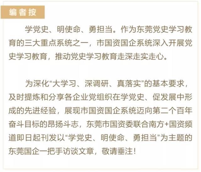 南方+:当前正处于“两个一百年”奋斗目标的历史交汇时期,全党集中开展党史学习教育,请谈谈贵公司是如何开展党史学习教育的,简要介绍学习方式和内容,以及结合党史学习教育办了哪些实事?尹锦容:今年是中国共产党成立100周年,也是国企改革三年行动承上启下的“落实年”。当前,东莞水务集团深入学习贯彻习近平总书记在庆祝中国共产党成立100周年大会上的重要讲话,立足“党建有亮点、管理有提升、改革有实效”目标,坚持把“红色”作为东莞水务集团开展党史学习教育的“底色”和“基色”,开展“红色”系列活动,加强理论武装,扎扎实实做好疫情防控、民生服务,改善水环境,做好水文章,持续提升东莞宜居城市品质。
