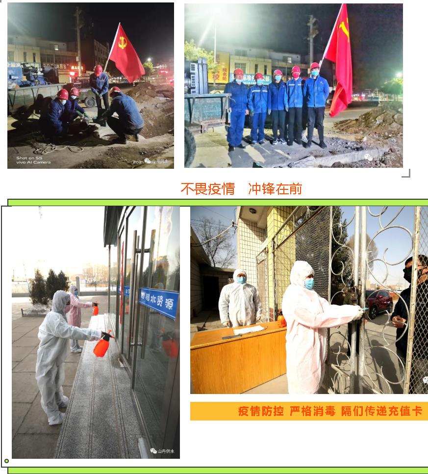严格按照山丹县疫情防控要求,公司积极响应防控措施,组织全员核酸检测,凝心聚力攻坚克难,确保安全供水,保持24小时通讯畅通待命,值班人员日夜坚守岗位,确保城乡居民用水服务,智能水表维护、供水管网抢修以及直饮水机维护人员随叫随到,不畏疫情,冲锋在前,充分发挥好党组织领导的群团作用,供水抢修党员先锋队、青年突击队、巾帼服务队,坚决守住疫情防控第一线。