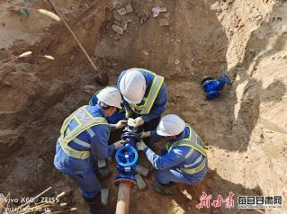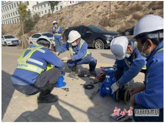 与此同时,供水服务公司抓紧对S569#路新敷设DN300管线进行冲洗消毒,供水西区管线所配合管线敷设进度,轮班实施标准化作业,快速完成管线对接及水表安装任务。大家累了靠沟槽歇一会,饿了坐在管线上吃几口盒饭,齐心协力与时间赛跑,在最短的时间内完成了为安宁区集中隔离点供水的任务。