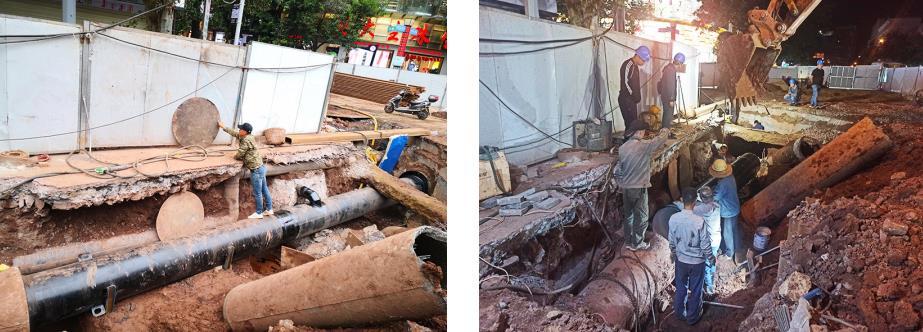 鹿城西路DN600混泥土管承担着楚雄市老城区供水任务,因近日中交生态公司在鹿城西路府后街口市政污水管道施工,大型施工机械反复碾压及械施过程中的震动对该位置管道造成了不可逆的损伤,虽然目前暂时能满足供水,但随时都可能发生爆管风险,存在供水隐患。