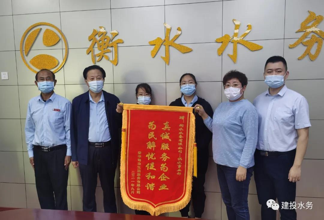 “感谢衡水水务公司供水事业部及时解决小区用户用水困难、抢修速度快、效率高”。近日,泰华锦业生活服务有限公司代表丽景福苑、建景家园、阳光花城物业服务中心将印有“真诚服务为企业 为民解忧促和谐”的锦旗送到建投衡水水务公司,对公司在小区多次爆管时及时维修的优质服务表示感谢。