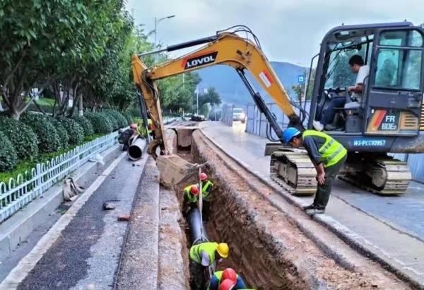 博山区津源供水有限责任公司本着安全施工、高效施工、清洁施工的原则,全面梳理每天工作内容,严把施工质量、严管作业安全、严控施工进度,昼夜施工为完成目标任务不懈努力。施工前期,公司多次进行现场勘查,确定管道敷设位置及施工时间,通过鲁中晨报和公司微信公众号等媒体,提前发布中心路施工公告,并在施工路段前方及分流路口设置公告牌,及时宣传引导,回应社会关切问题,最大限度缓解因施工为市民带来的出行不便。公司事先与移动、联通、电信、燃气等单位进行对接沟通,确认地下均无电缆、燃气等管道,方才启动施工。由于此次施工区域位于中心路,过往人、车流量大,路面水泥厚,给施工带来一定难度。集团采用分段施工、同时进行的施工策略,采取雾炮作业方式,减少扬尘污染。特别是交通高峰期,在不利于机械作业的沟槽内仅留有2-4名人员进行人工开挖。工作人员充分发挥“白加黑”、“5+2”工作精神,努力克服阴雨天气影响,提前完成施工任务。新安装供水管线采用优质的球墨铸铁管,水质得到明显保障,水压、水量更为稳定,让居民用水更加安全优质。