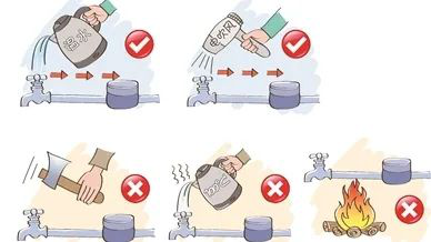 温水慢火,逐步融化: 对已冰冻的水龙头、水表、管道,宜先用热毛巾裹在水龙头上,然后浇温水,使水龙头解冻,再拧开水龙头,用温水沿水龙头慢慢向管道浇淋,使管道解冻。