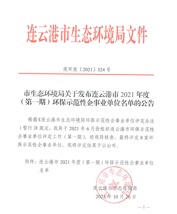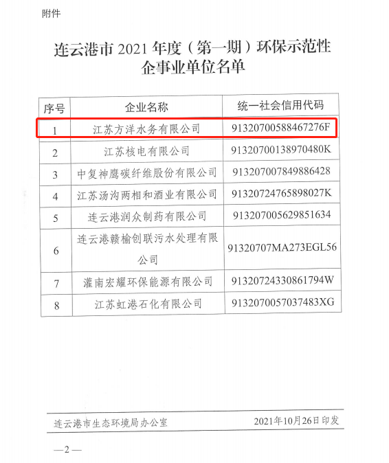 根据《连云港市生态环境局环保示范性企事业单位评定办法(暂行)》和《开展环保示范性企事业单位申报工作(2021年第一期)》等有关文件要求,方洋水务通过自主申报、材料提交、审查评议等筛选流程,最终获得了连云港市“2021年度(第一期)环保示范性企事业单位”荣誉称号。