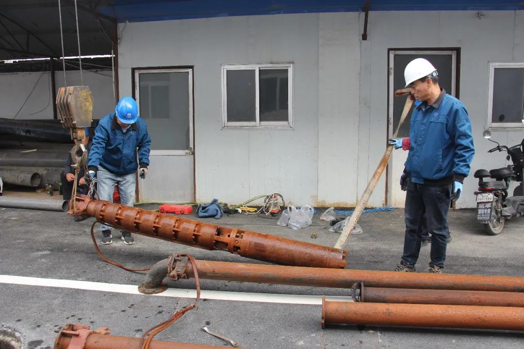早晨不到八点,技术员和检修工就早早做足了准备工作。卸井口,拆扬水管、螺栓及深井泵,他们认真对井下所有设备进行检查维护。历经6个小时7号水源井顺利检修完毕,恢复正常运行。