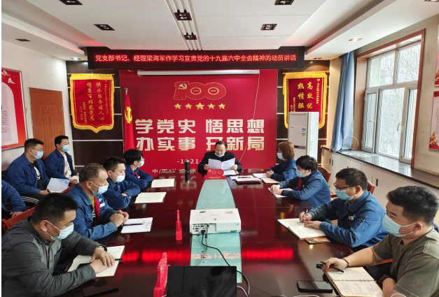 党支部书记、经理梁海军带领大家集中学习了《中国共产党第十九届中央委员会第六次全体会议公报》,对学习宣贯党的十九届六中全会精神,作了动员讲话。梁海军强调:全体党员干部要迅速掀起学习热潮,利用多种形式、依托多种媒介、拓展多种渠道学习好、宣传好、贯彻好。准确把握核心要义,在学懂弄通做实上下功夫见实效,将全会精神切实转化为干好当前各项工作的强大动力,层层压实责任,对年底各项工作查漏补缺,确保年度各项指标任务圆满完成,为推进供水公司高质量发展而努力奋斗!