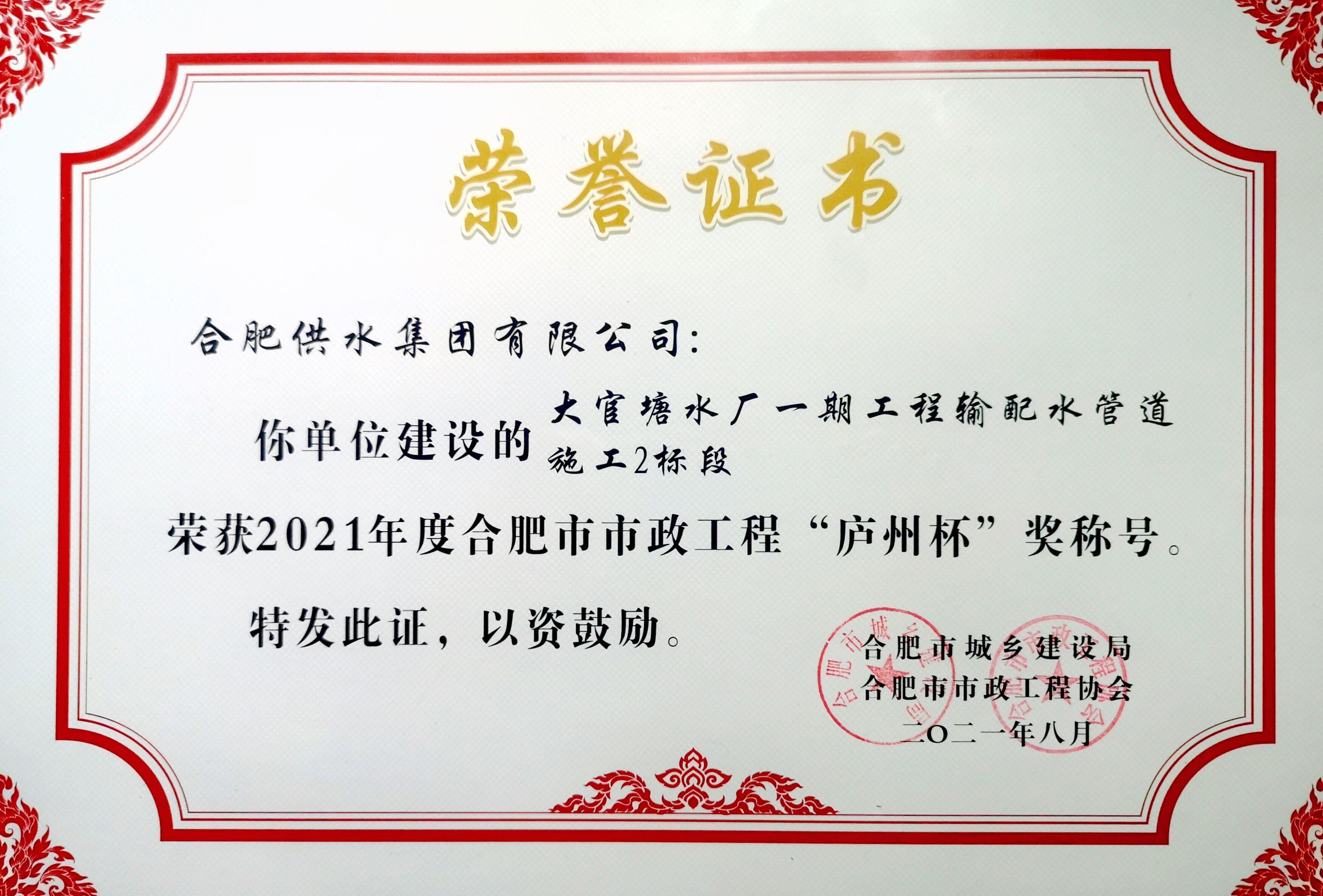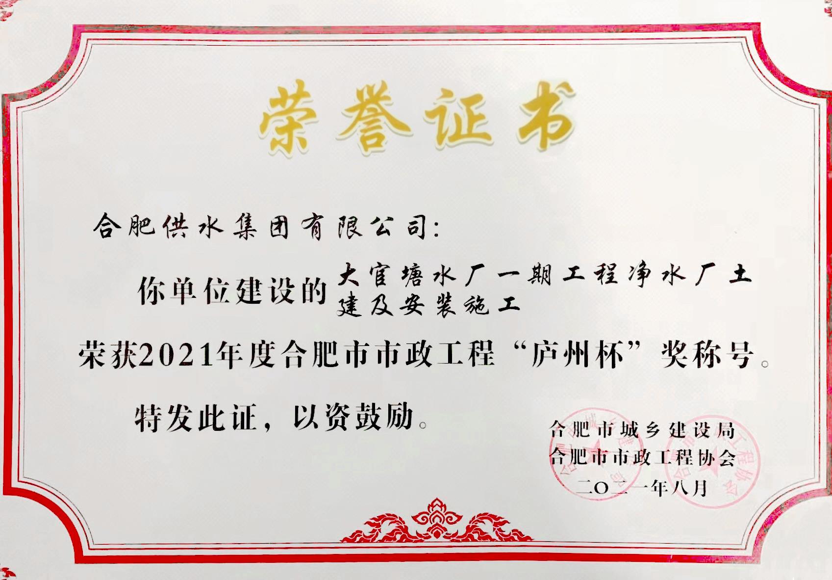 近日,合肥供水集团重点工程建设再传喜讯。八水厂(大官塘水厂)一期工程净水厂土建及安装施工、八水厂(大官塘水厂)一期工程输配水管道施工2标段荣获2021年度合肥市市政工程“庐州杯”奖称号;六水厂提升改造工程荣获“2021年度第三批安徽省建筑安全生产标准化工地”荣誉称号。