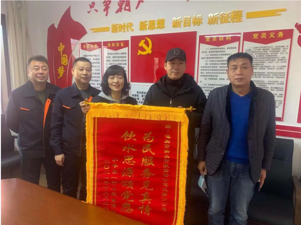 近日,和平村东一村村民为供水公司昆南分公司送来一面印有“为民服务见真情,饮水思源颂党恩”的锦旗,对供水公司全力解决村民饮水问题表示肯定和感谢。
