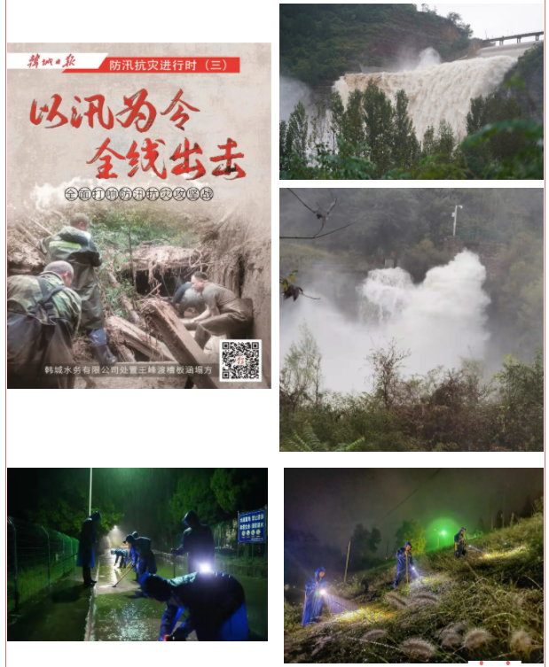 今年8月下旬到10月上旬,韩城市遭遇强降雨天气,薛峰水库流域平均降雨量达到1048.1mm,总进水量达到1.87亿m³,出库水量达1.79亿m³;盘河水库流域平均降雨量达到562.5mm,总进水量达到3808.01万m³,出库水量达3622.48万m³。水库经受了自1988年以来最大洪水的严峻考验,公司班子成员分别带队驻守各水库、供水厂,严格按照省市防总及集团公司防汛工作要求,坚持24小时带班制度,降雨量超过10毫米全员到岗,全体干部职工从8月下旬到10月上旬严阵以待坚守防汛一线,扎实做好防汛工作,确保了六座水库安全度汛。