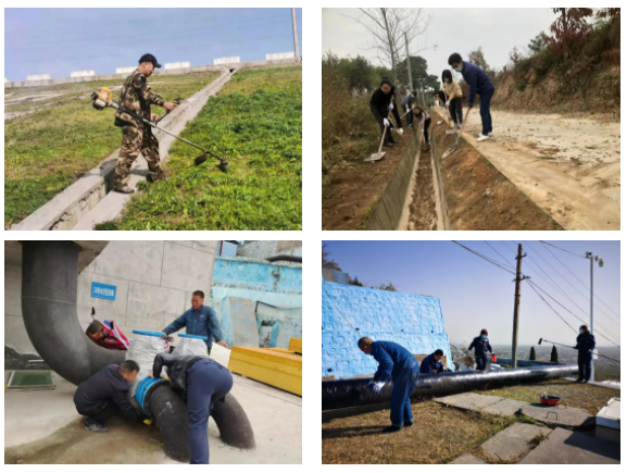 为保证城镇供水、农田灌溉、防洪保安等工作顺利开展。公司组织干部职工400余人,利用5月至6月下旬、10月中旬至11月下旬两个时段,开展了夏、冬两季维修养护工作。共计完成水库大坝及干支渠除草整修40.84万㎡,干支渠维修养护372千米、清淤3.1万m³;维修养护应急水源井16眼,清理维护水表井8000多座,为水表加装保温棉2000余套,保养消火栓70余座、加戴防冻帽41个,更换水表28块,更换阀门26套,墙面亮化9300多㎡,并完成全部重点部位机电设施、加压站、启动柜、变频柜、高压线路等维修保养,为公司的水利工程设施安全运行提供有力保证。