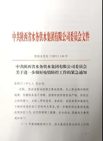 陕西新冠肺炎疫情发生后,供水集团党委对疫情防控工作领导小组成员进行了调整,夯实了工作责任。2021年12月18日,印发了《关于进一步做好疫情防控工作的紧急通知》,从全员核酸检测、日常防控管理、人员流动管理、会议活动管理、值班值守等方面,对供水集团系统疫情防控和供水安全保障工作进行了安排部署。班子成员分片包抓,及时掌握各县(市、区)公司疫情防控和安全供水情况,对工作中遇到的问题,立即研究解决,确保各县(市、区)公司疫情防控与供水保障工作有序开展。供水集团党委、工会分别向坚守一线和在家隔离人员发出一封信,鼓舞了士气,提升了干部职工凝聚力。在疫情防控的关键时刻,供水集团党委积极响应省委组织部和团省委号召,总部7名党员干部下沉社区、2名志愿者深入疫情防控一线,协助开展扫码测温、人员摸排、核酸采样、维持秩序、送菜买菜、防疫宣传等工作,切实发挥党员干部模范带头作用,为疫情防控贡献力量。