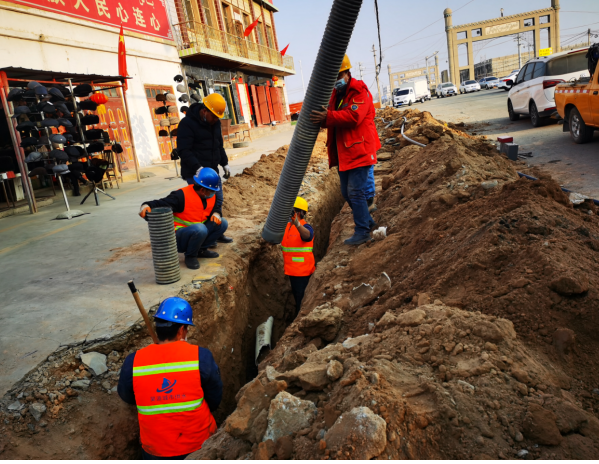 经检查,造成该片区没有水的原因是由于部分用户家中无人,房子里管道冻裂的水流回片区供水主管道,将片区主管道一并冻裂,同时形成大面积的冻土层。在多次推敲研究对比之下,得出另铺设一条管道将是最快解决供水问题的方案,于是划定最科学合理的管道路线,采用开挖和铺设同时进行的方式,力求在短时间内完成供水恢复工作。