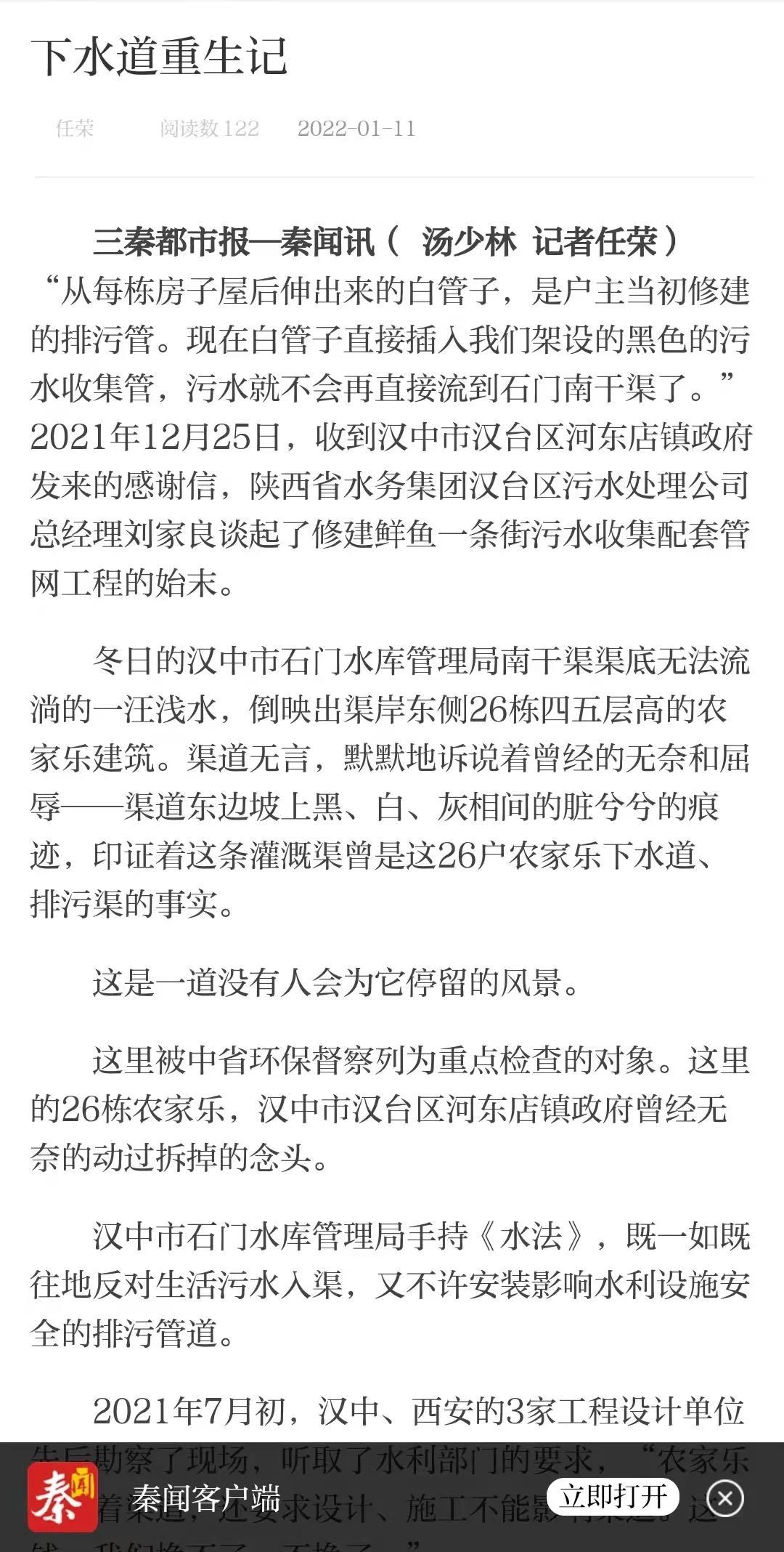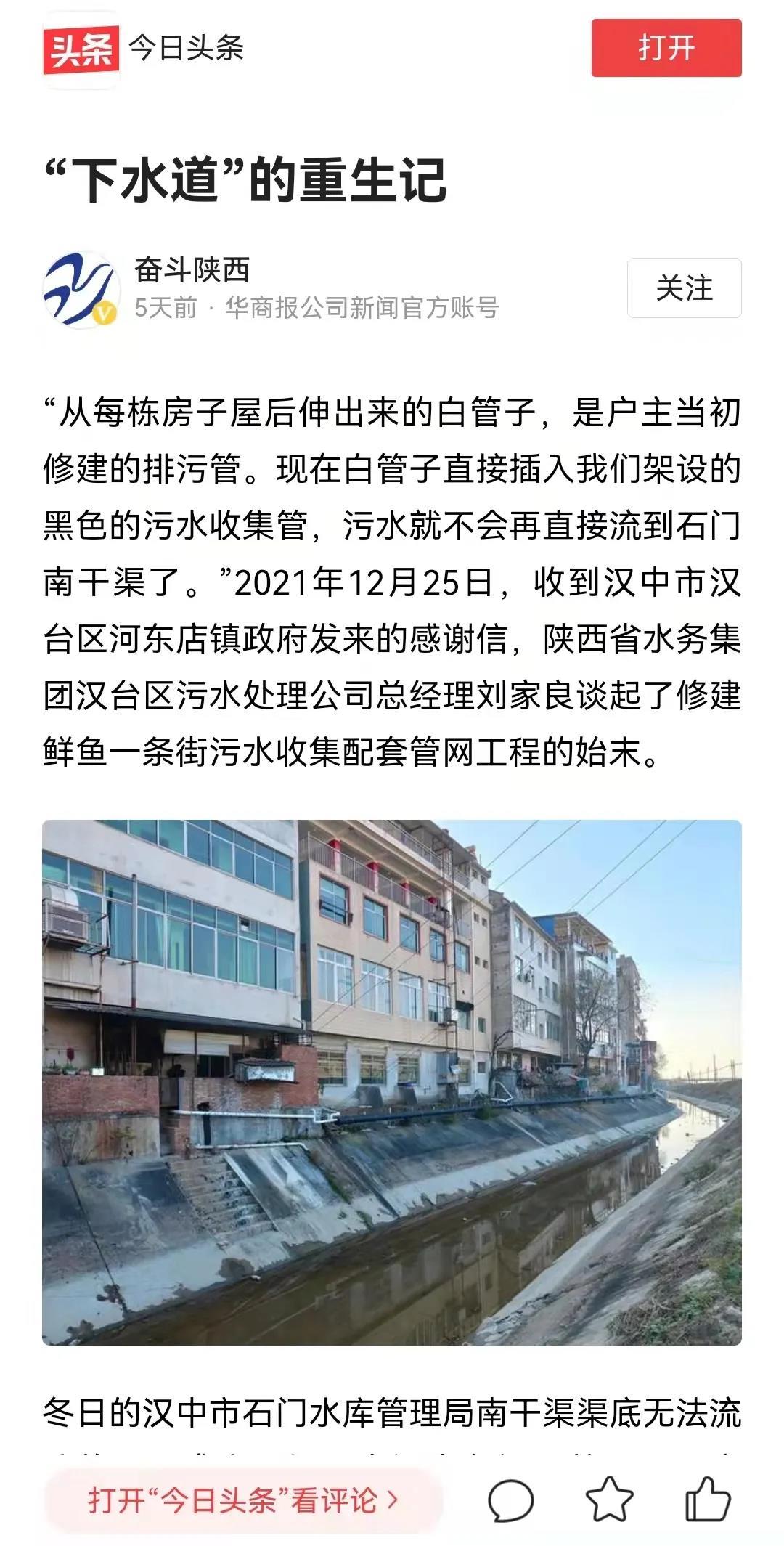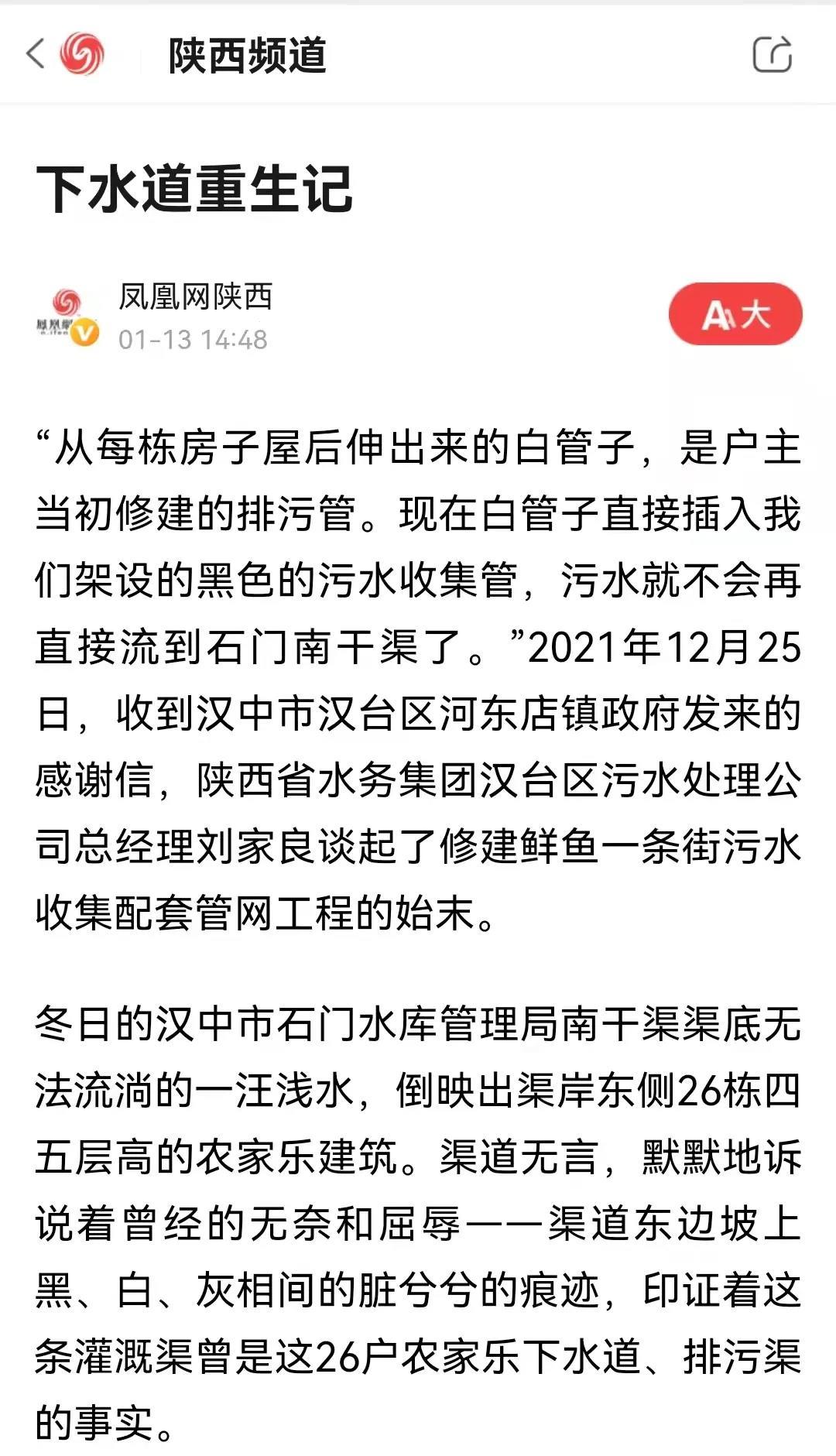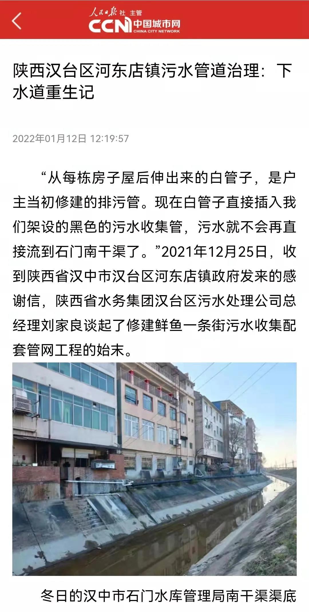 “从每栋房子屋后伸出来的白管子,是户主当初修建的排污管。现在白管子直接插入我们架设的黑色的污水收集管,污水就不会再直接流到石门南干渠了。”2021年12月25日,收到汉中市汉台区河东店镇政府发来的感谢信,陕西省水务集团汉台区污水处理公司总经理刘家良谈起了修建鲜鱼一条街污水收集配套管网工程的始末。