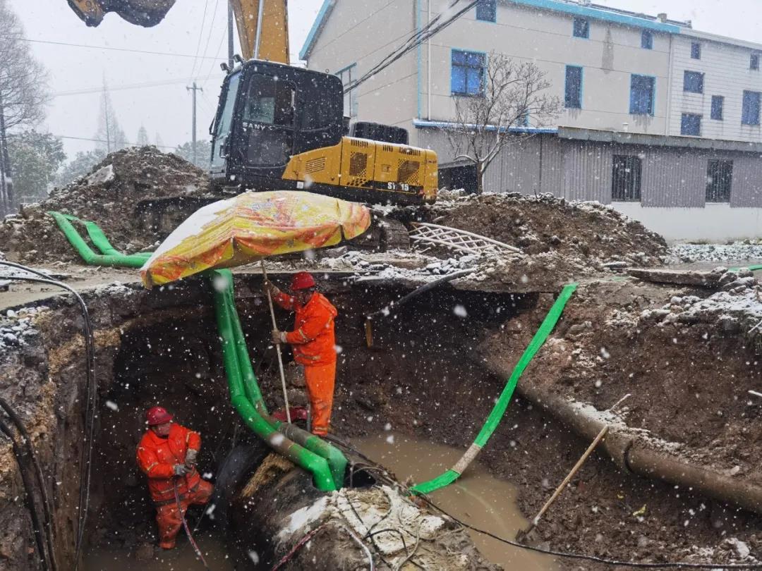 受寒潮天气影响,2022年2月6日晚22时11分,常水热线88130008接到郑陆羌家村村民电话,称DN1600主供水管线有自来水涌出,通用水司管网抢修人员23点左右奔赴现场,考虑到会淹没农田,第一时间通知西石桥水厂停产,并及时开展抢修工作,组织抢修人员和抢修物资,考虑到暴雪来袭,还准备了草垫、融雪盐等抗雪物资。