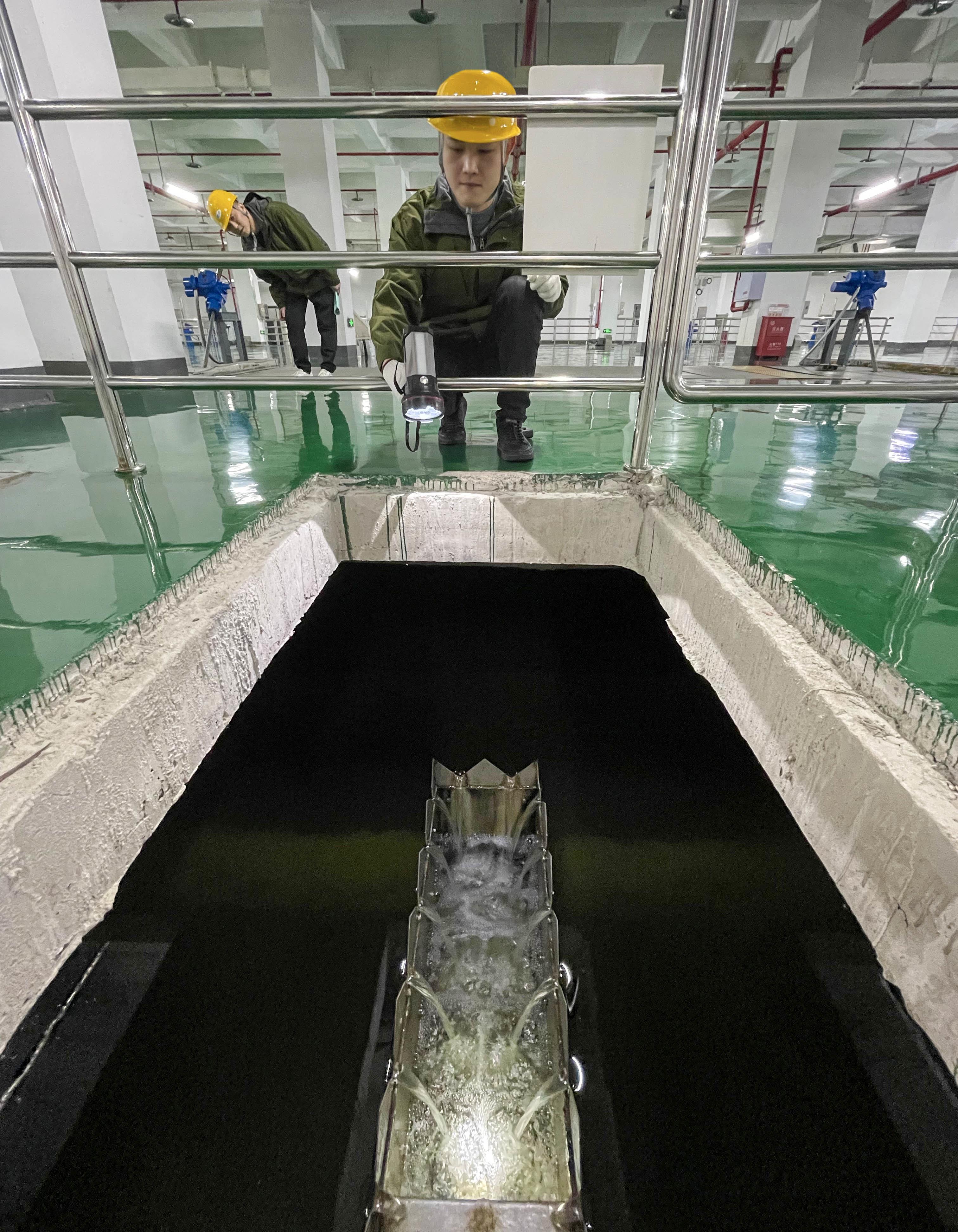 ▲2022年2月2日,三峡水务公司悦来污水处理厂,巡检班长何志明(右)和同事正在仔细察看位于盖下的二沉池的水质。记者 张锦辉 摄/视觉重庆