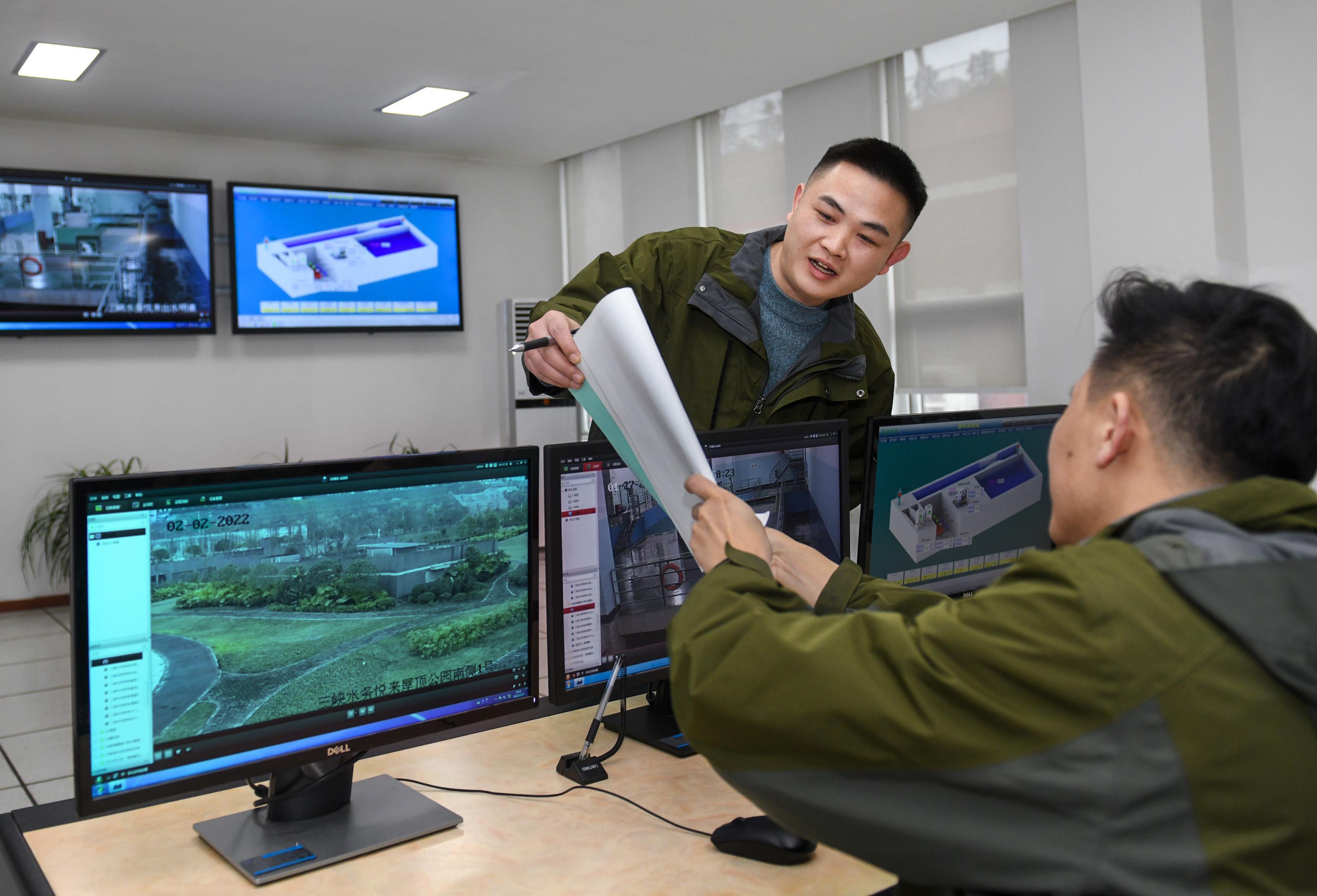 ▲2022年2月2日,三峡水务公司悦来污水处理厂,巡检班长何志明和同事在中控室讨论方案。记者 张锦辉 摄/视觉重庆
