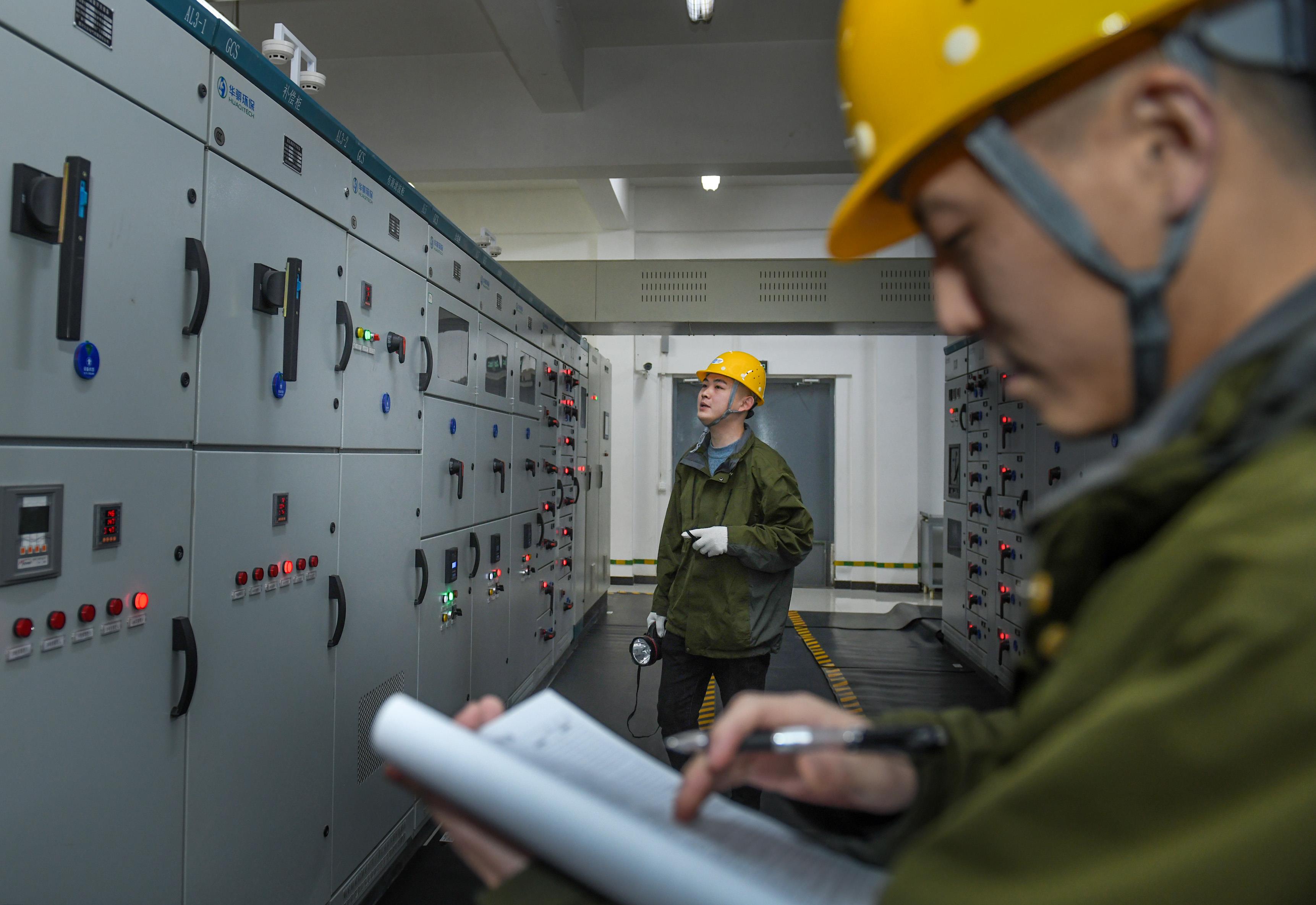 ▲2022年2月2日,三峡水务公司悦来污水处理厂,巡检班长何志明(左)和同事在配电室抄表。记者 张锦辉 摄/视觉重庆