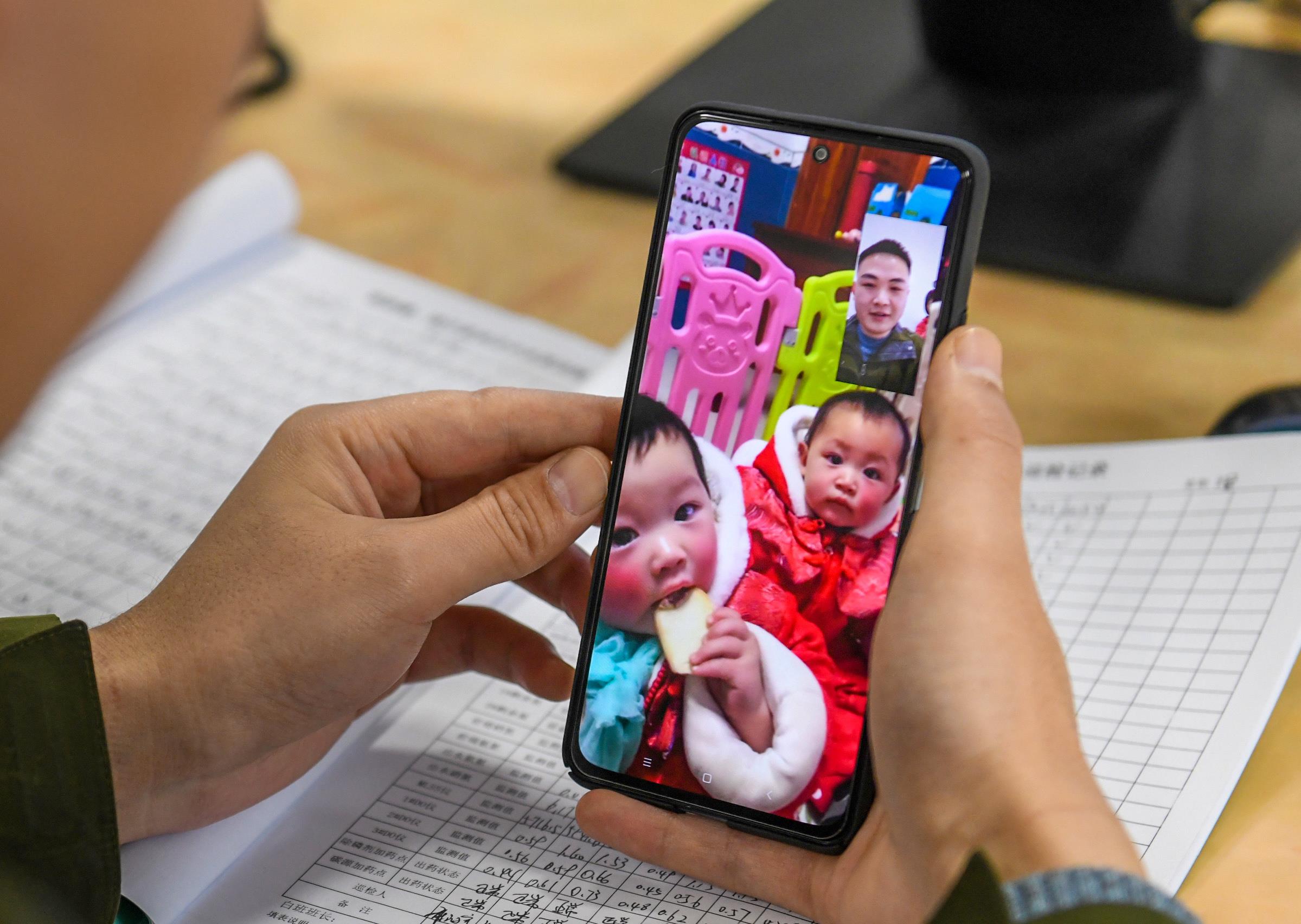 ▲2022年2月2日,三峡水务公司悦来污水处理厂,巡检班长何志明通过视频电话看看在湖北老家的双胞胎儿女。记者 张锦辉 摄/视觉重庆