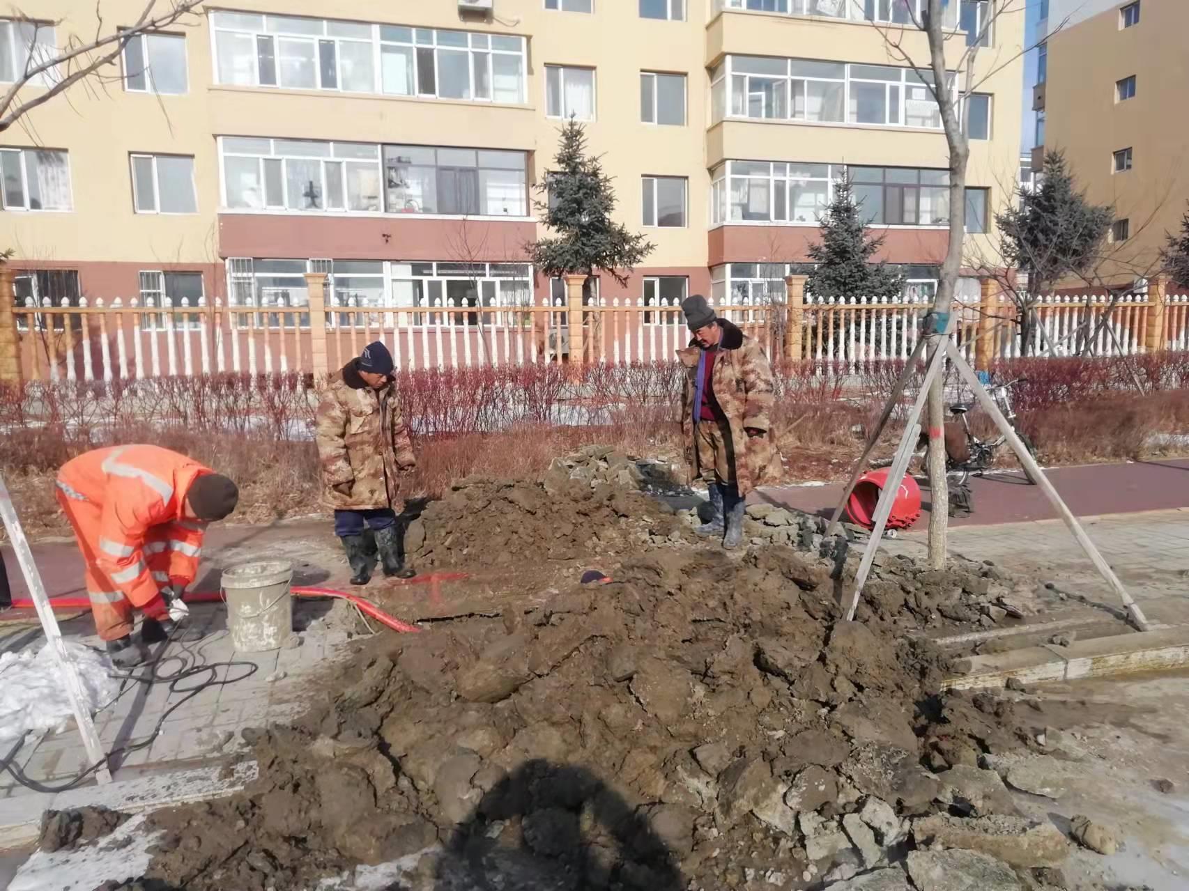 近日,珲春市城投集团供水公司管线巡查人员在林业城老区住宅南侧巡查时,发现彩砖处有一处积水结冰,经勘察初步确定是供水管线漏水,在与珲春市市政管理中心申请破道后,开始抢修,考虑结冰处与绿化带的树木很近,又不能破坏太多彩砖与路面,决定采取人工挖土的方式进行查找漏水的供水管线。