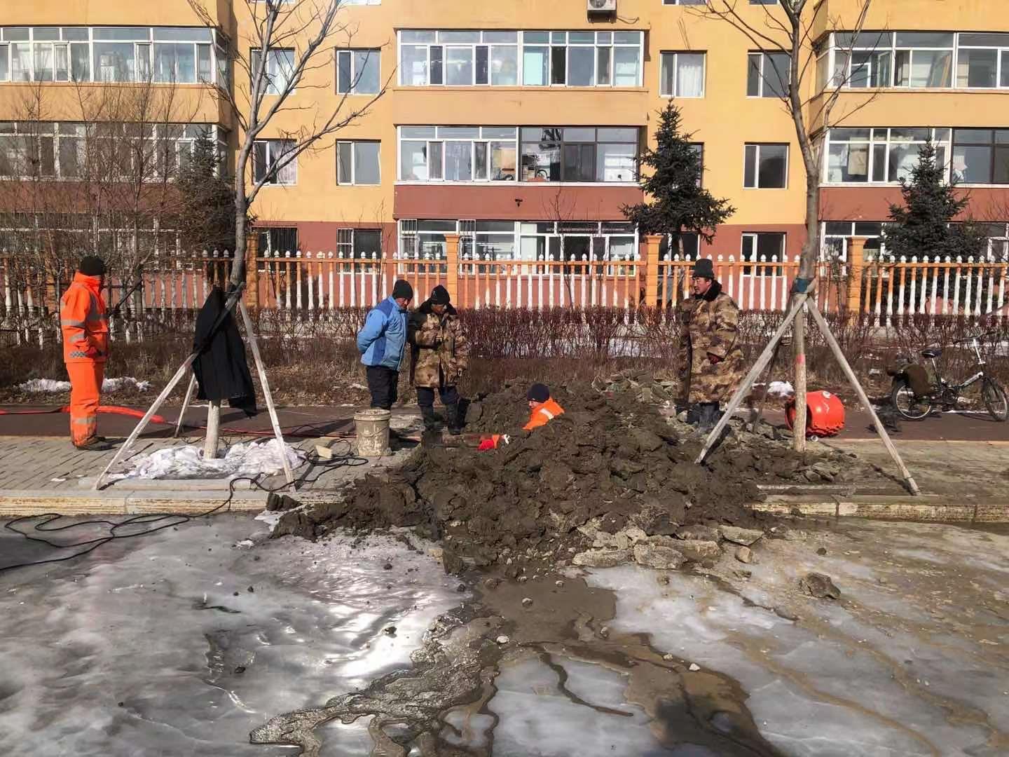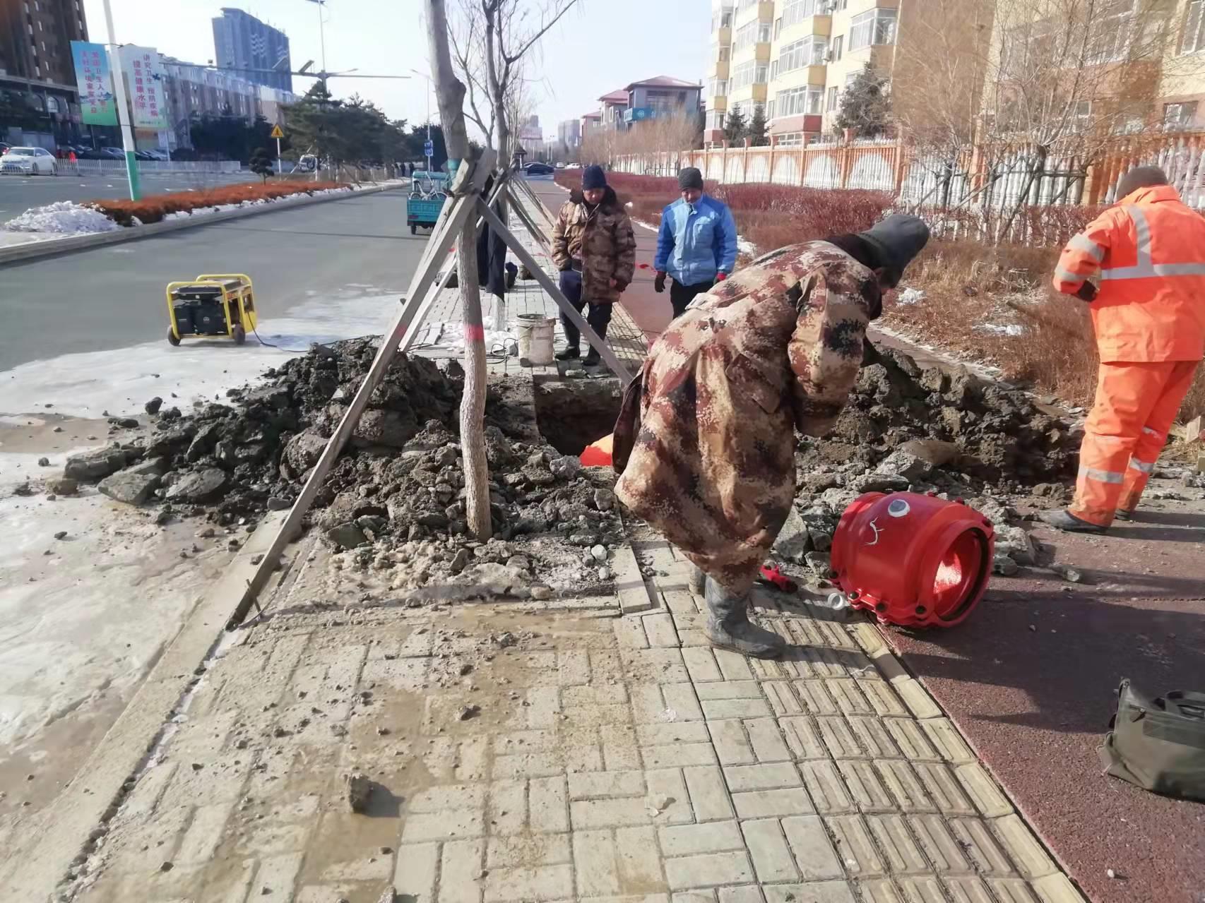 现在正是寒冬腊月,冻层已到1米,人工挖掘起来非常困难,只能用电镐进行挖土,一个人挖不动了,就换一个人再挖,为了尽快找出漏水点,只能是换人不停镐,经过了几个小时,终于找到了DN300供水管道接口的漏水点,按照常规抢修,需关闭阀门,停水后抢修更便捷,但是停水抢修,会影响周边居民的正常用水,为了避免停水对周边居民造成的影响,加上漏水面积不是太大,现场决定带水作业抢修,流出来的水打湿了抢修工人的衣服,抢修人员争分夺秒,用最短的时间将供水管线接口处更换了补漏器,在不影响居民用水的情况下完成了这次抢修任务。