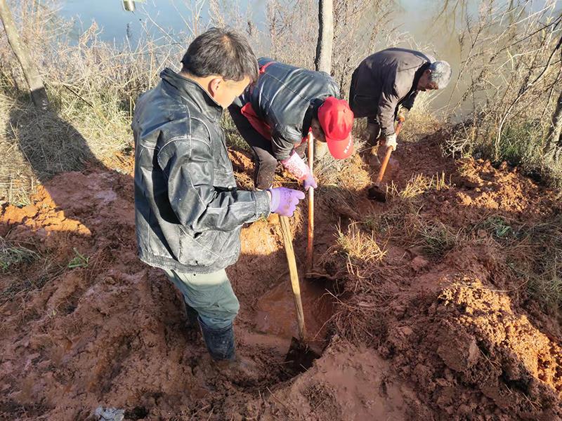 近日,者海工业区水厂于早晨7:05分接到村委会的报修电话后,工作人员立即赶往现场查看情况,发现位于者海村大海坝从花渔洞水库至厂区的DN200镀锌钢管原水主管道总共有5处漏水,水从地下渗出到地面。者海水厂立即启动管网抢修应急预案,实施紧急抢修,抢修人员、车辆、抢修物资在短时间内迅速集结到位,于7:45分到达现场,并根据抢修应急预案,关阀停水,打开排泥阀排空管道遗留水后,抢修人员立即按照拟定抢修方案紧张有序地用电镐、十字镐、铁铲、条锄、板锄人力开挖4个长约1米,宽约1米,深约80CM的土方,一个近5米长的沟,为防止管道“二次受伤”,靠近管道的部分只能用手小心翼翼一点一点的把土刨出来;在狭小的泥坑里他们争分夺秒对受损管道进行切割、焊接、轮流作业,一时间焊机、发电机、抽水泵的声音此起彼伏。