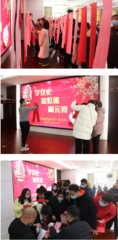 “永跟党中央,打一字”、“舌战群儒(打一党史人物)”、“爱我中华爱我党,猜一歌曲”,融合知识性、趣味性为一体的党史谜语悬挂在会议室供党员职工竞猜,一条条粉红色的谜语引起了大家的浓厚兴趣,大家纷纷驻足观看猜谜,灯谜内容丰富广泛,除了字谜、成语谜,还涉及党史等信息,既有通俗易懂的趣味猜题,也有较为复杂的抽象谜题,既具娱乐性,又具知识性。随着活动的进行,吸引了越来越多的职工前来猜谜,他们有的盯着谜题凝神思考,有的为自己猜中谜底露出喜悦的表情,兴奋地到兑奖处领奖品,猜不完的灯谜、说不够的吉祥话、道不完的节日情,阵阵笑声、欢呼声不时传出。