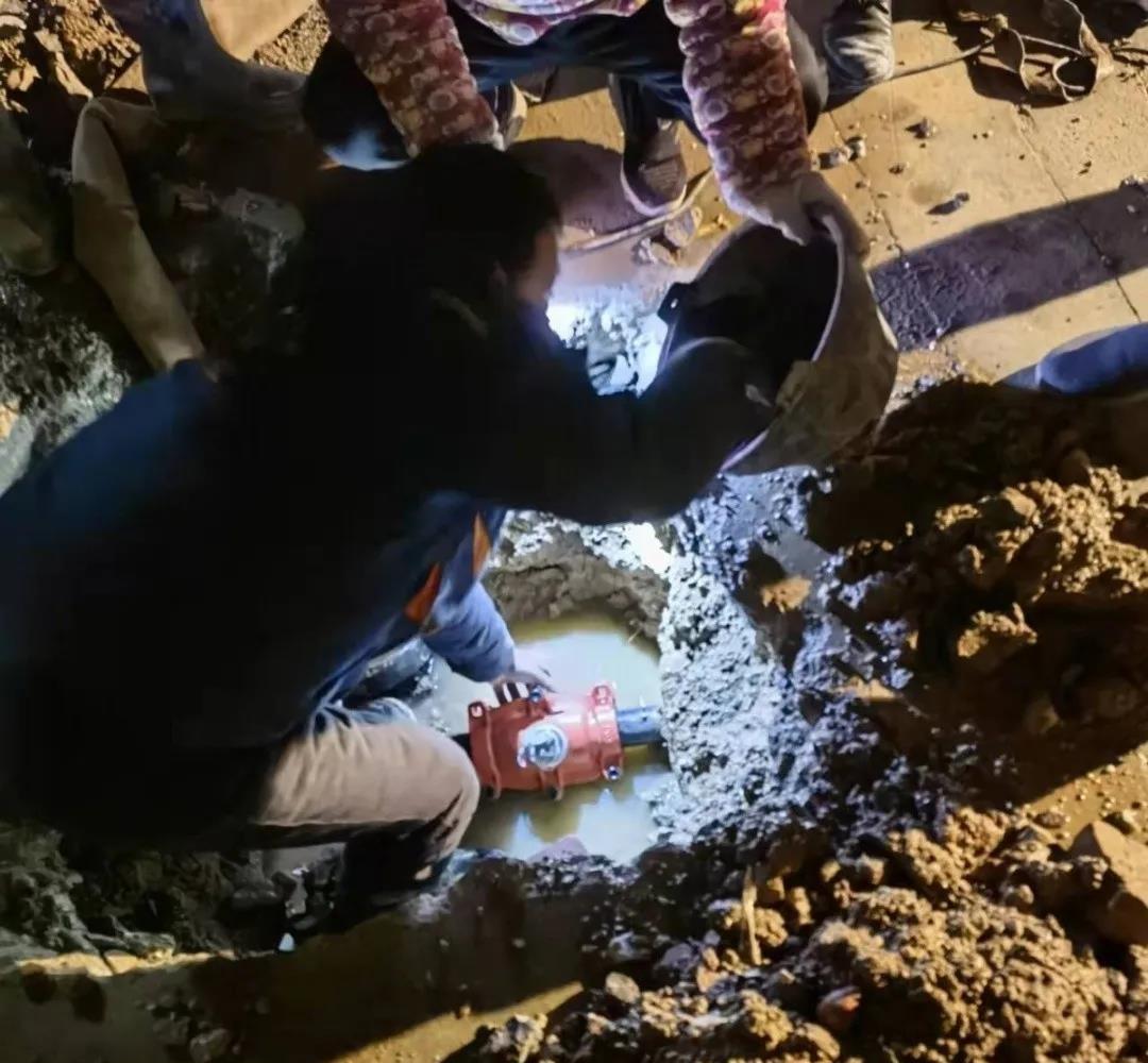 晚上19:30抢修人员与工程车同时到场,这时也锁定了漏水点。通电、照明、破拆,抢修工作随即展开。20:20挖至离地面40公分处,水从爆管裂口处喷涌而出,抢修人员立即通知物业对该小区下达停水通知。待水压停稳,确认为PE63口径管道爆裂,庆幸的是爆管裂口不大,用哈夫节即可快速修复。21:30抢修完毕,相关阀门全部开启,供水恢复正常;抢修人员回填工作坑,设置警示标志并清理现场,抢修工作顺利结束。