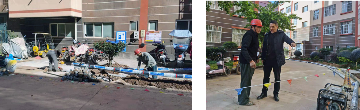 本月双柏县绿色佳园小区“一户一表”改造工程正式启动,公司总经理陈学丹到施工现场进行检查,进一步规范施工现场。此次检查重点对工地围挡、加强易扬尘物料覆盖、施工人员的安全防护等内容进行检查,加强了施工人员的安全责任意识,确保各项安全措施落实到位。对于现场检查发现的施工材料堆放杂乱、施工人员安全意识不强等问题,总经理当场提出整改意见,要求施工队立行立改,不要存有侥幸心理,抓好落实,确保各项问题有效解决。对开挖的沟槽不得过夜,当日开挖当日回填,特殊情况不能及时回填的沟槽要用围档进行围封处理,并放置警示标志牌,不得影响小区居民正常生活,庭院沟槽回填后,及时清理沟槽周围浮土,确保环境整洁。
