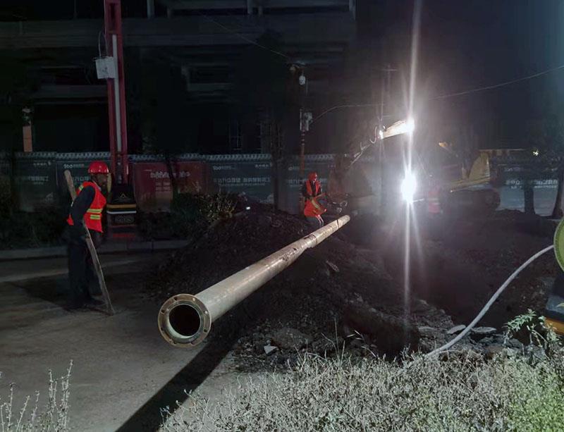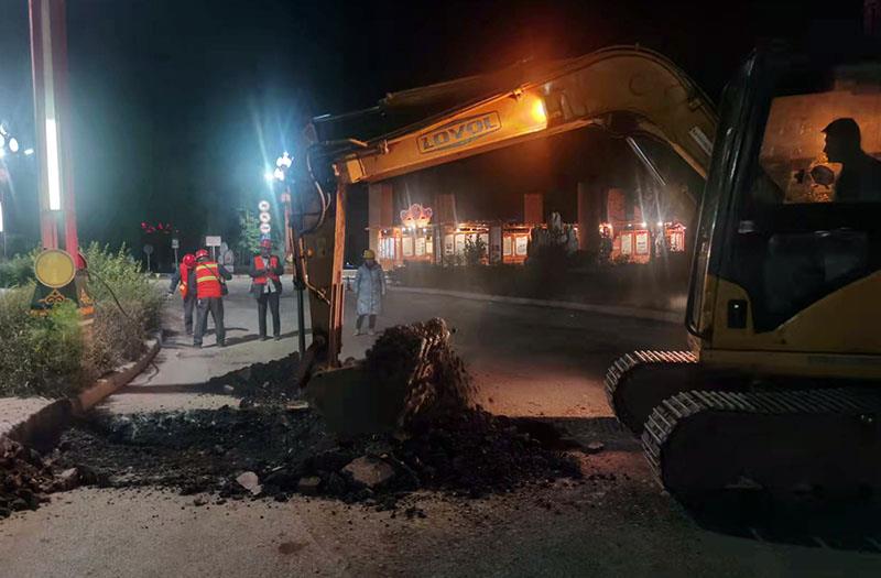 预埋管路地点位于双柏县城进城口,需横跨公路进行铺设管路,为了不影响车辆进出,管线组工作人员选择在车流量较少的夜间施工。夙兴夜寐,靡有朝矣。经过连续5个多小时的奋战,工作人员在凌晨4点完成对DN200供水主管的横跨路面铺设。