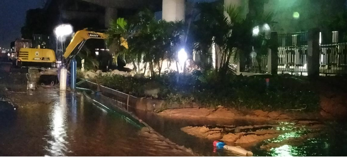 水环境公司巡管人员立即赶往现场,核实勘查情况,并按应急抢修要求做好安排。现场人员迅速确认冒溢范围,并沿冒溢范围联系相关管线单位和抢修班组到现场协助拟定抢修计划。在安全围挡到位后,迅速安排现场开挖,寻找爆管的位置,拟定工作方案。随后,按应急方案调配挖掘机械、临时配电照明,并通知仓库准备抢修材料等,抢修配件现场加工人员随时听候调遣。