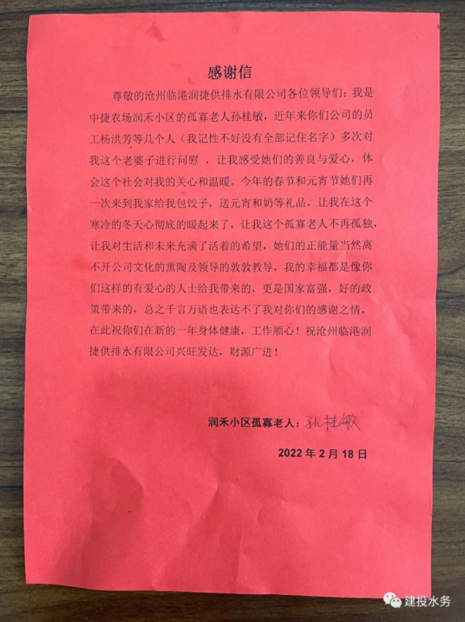 “他们的正能量离不开公司文化的熏陶及领导的谆谆教导,我们的幸福都是像这样有爱心的人士带来的……”近日,孤寡老人孙桂敏阿姨委托一位爱心大姐将一封感谢信送到沧州供排水临港润捷公司,“纸短情长”字里行间表达了这位老人的感激之情。