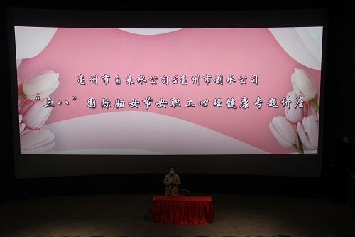 为庆祝第112个国际妇女节,营造清澈阳光的工作氛围,近日,市自来水公司、市制水公司联合开展庆"三八”妇女节系列专题活动。活动邀请了国家二级心理咨询师,海蓝博士静修生,牛志红老师作心理健康知识专题讲座,来自公司90余名女职工现场聆听。