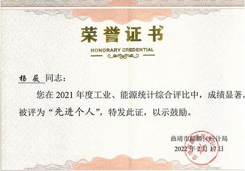 公司运营管理部杨薇同志负责对口填报区、市统计局资料,一直认真负责、及时完成统计局各类资料的报送工作。她不断的提高自身素质,以保证公司“一套表”联网直报工作高效有序的进行,充分利用业余时间坚持自学,熟练掌握电脑知识、直报系统操作知识等,脚踏实地、勤勉工作。因其工作成绩突出,近日,杨薇同志再次获得曲靖市麒麟区统计局授予的2021年工业统计“先进个人”荣誉称号。