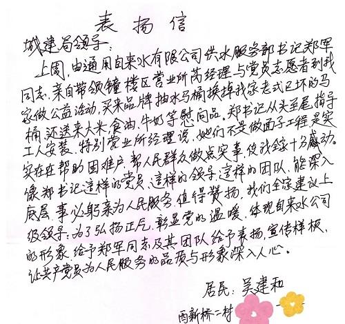 近日,通用水司收到市住建局办公室转来的一封手写感谢信,写信的是西新桥二村的居民吴先生,已经七十多岁。信中,吴先生对通用水司志愿者们帮群众办实事,深入基层解民忧表示诚挚的感谢。