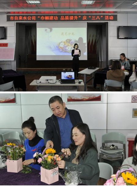 3月8日,淄博市自来水有限责任公司“巾帼建功 品质提升”庆“三八”活动举行,公司40余名女员工代表参加插花沙龙等活动。市水务集团党委委员、监事会主席蒋万海,党委委员、副总经理赵永力,公司执行董事王庆峰、党委副书记韩文韬出席活动。