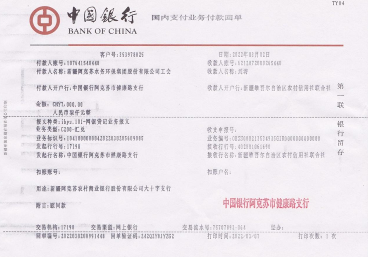 关爱互助,扶危济贫是中华民族的传统美德,阿克苏水务集团用爱心为生命续航。病魔无情人有情,水务集团党委、工会在得知员工刘涛做肾移植手术的消息后,2022年3月2日,在全集团发出了“爱心捐款倡议书”,希望大家献一份爱心,尽一份力量,伸出援助之手,用爱心托起生命的希望。