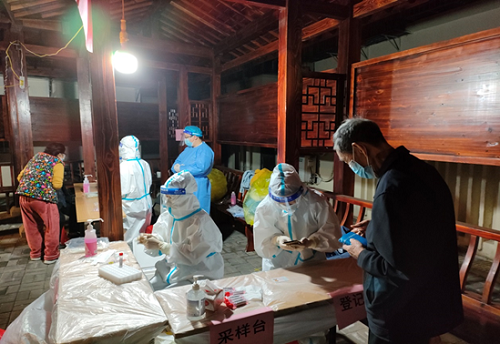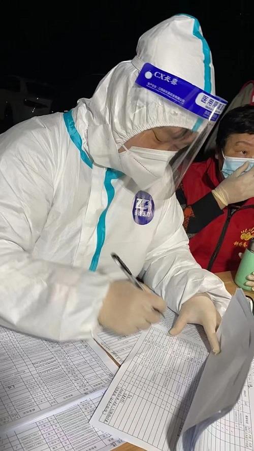 13日晚17:30,响应政府号召,业主们开始有序排队等待核酸检测。队伍越来越长,登记人员信息需要时间,有些业主开始发起了牢骚。疫情当前,全力配合政府完成首轮筛选,才是大家的首要任务。穿上红马甲的陈刚在队伍里喊道:“都是为了大家的健康安全,耐心等待一会儿,医生马上就到,我们有这么多人帮忙,很快就会结束的!”“年纪大站不住的先回去休息,一会儿空一些了我们上门来喊!”晚到一会儿的承力忍着腰痛艰难地换上了白色防护服,在核检处给上了年纪的业主注册“核酸采样码”。核酸检测开始,夫妻俩按照社区分工,一个疏导人群,维持秩序;一个守着花名册给每位完成检验的业主做好信息登记发放检测证。