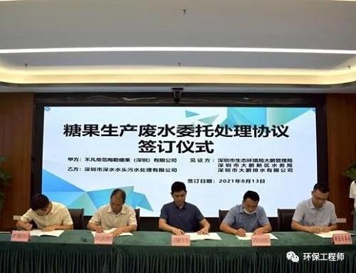 深圳市深水水头污水处理有限公司、不凡帝范梅勒糖果(旗下产品有阿尔卑斯等)深圳有限公司举行了《糖果生产废水委托处理协议》签约仪式。市生态环境局大鹏管理局、大鹏新区水务局、大鹏排水有限公司作为见证方共同签署了《糖果生产废水委托处理协议》。