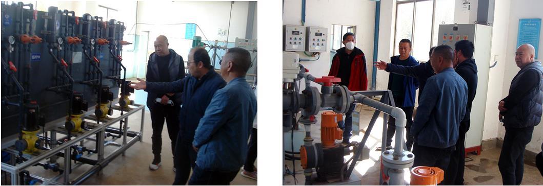 在制水加药车间,三水厂杨厂长就厂部生产运行情况、工艺设备等进行了介绍,沾益水司详细了解了三水厂新安装的次氯酸纳投药设备和聚氯化铝加药系统使用效果及生产控制、净水工艺参数,并就双方源水水质、药剂投加量、水处理技术展开深入交流及探讨。
