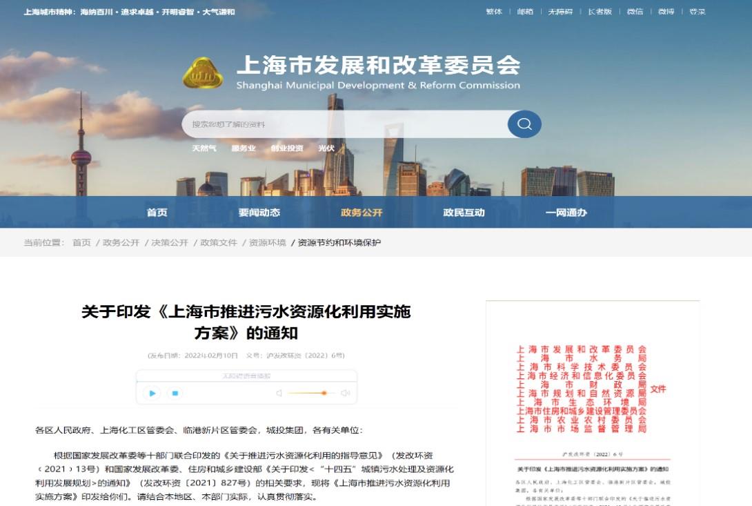 2021年1月,国家发展改革委等十部委印发《关于推进污水资源化利用的指导意见》(发改环资〔2021〕13号)(以下简称《指导意见》)。为贯彻落实国家相关要求,进一步推动本市污水资源化利用工作,上海市结合实际,在对本市污水资源化现状及发展进行深入调研的基础上,发布《上海市推进污水资源化利用实施方案》(沪发改环资〔2022〕6号)(以下简称《实施方案》),《实施方案》提出“到2025年,再生水利用量持续提高;在城镇、工业、农业等领域推进10个污水资源化利用试点项目,各郊区建成‘一区一点’污水资源化利用特色亮点”等具体目标。到2035年,初步建立具有上海特点的污水资源化利用格局。
