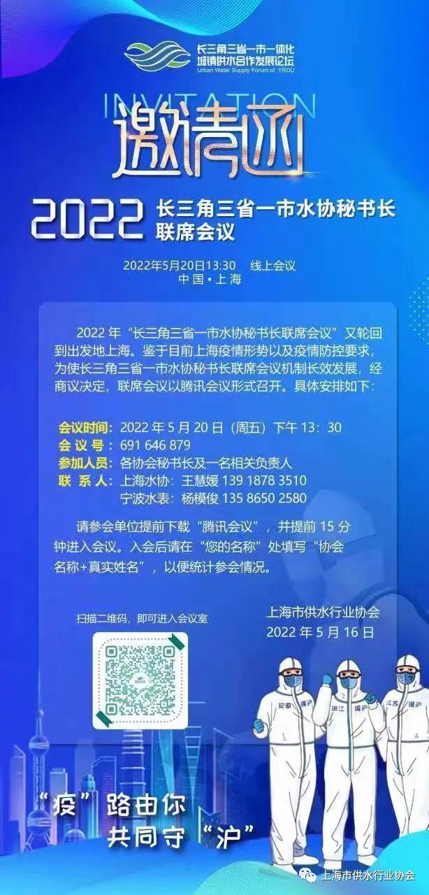 5月20日下午,长三角三省一市水协秘书长联席会议以视频会议形式召开,来自江浙沪皖三省一市约30位嘉宾出席会议。上海市供水管理事务中心主任朱慧峰、上海市供水调度监测中心主任顾晨、江苏省城镇安全供水保障中心主任徐建、上海市供水行业协会会长申一尘、监事长钱松宇以及副会长陈士忠、王海亮、卢正洪等领导参加会议,市水务局总工程师高昊旻出席会议并致辞。