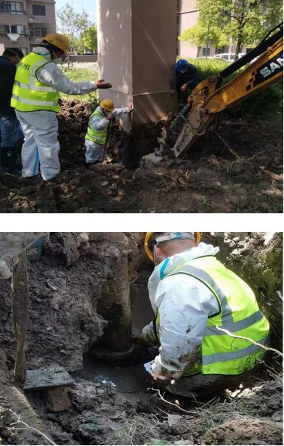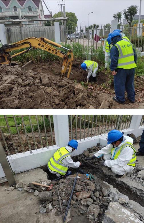 经现场初步勘查,漏点为物业维护范围的DN150管道。但由于该管道下方管线铺设复杂、且漏点位置深达2米,需调用挖机等机器进行现场作业。考虑到疫情期间物业、居委无法自行修复,老百姓居家无水可用更加心忧,养护站员工主动延伸服务,连续作业6个小时,终于清除管道“病灶”,两幢楼的居民恢复了正常用水。